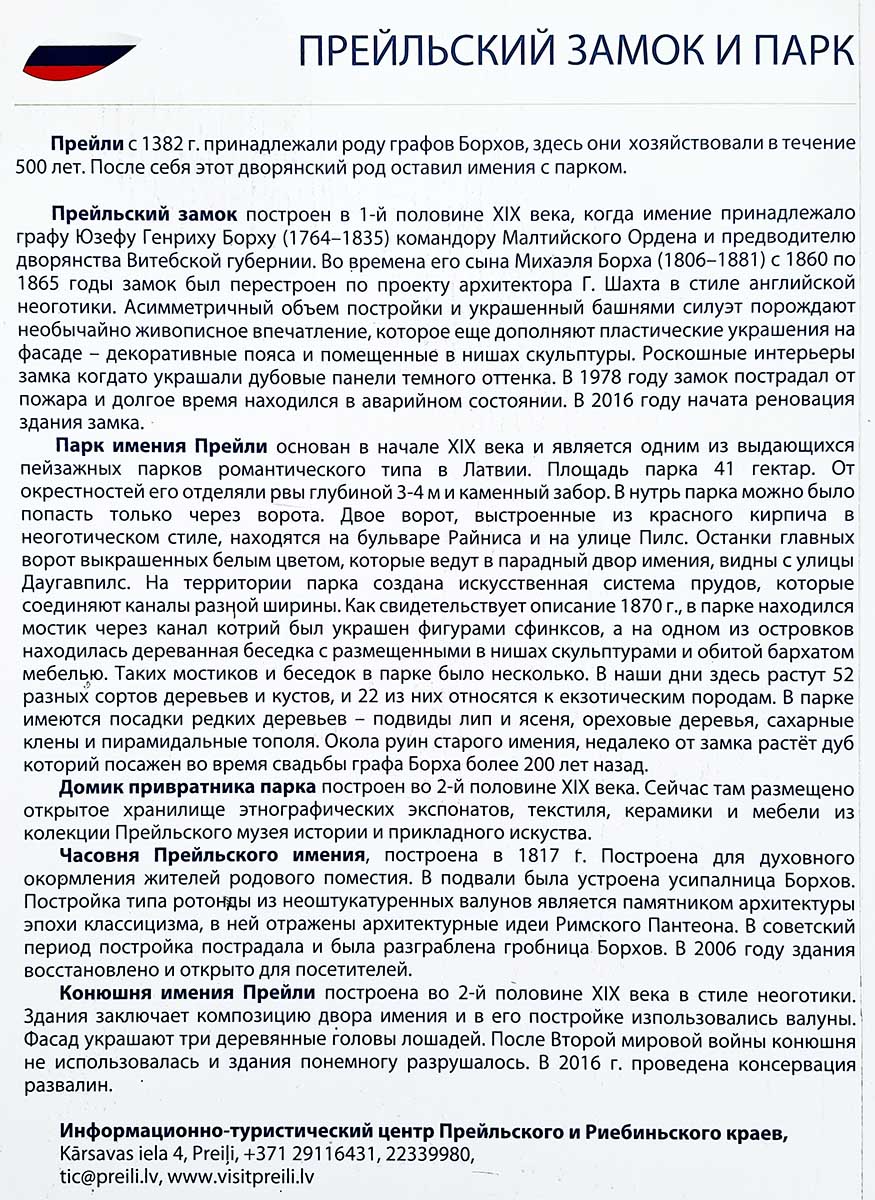 Владельцы фон дер Борхи вместо разрушенного замка построили новый, сгоревший в начале XVIII века. Вместо него опять построили новый господский дом. Прейли принадлежали семье Борхов много столетий с XIV в. до 60-х гг. XIX в. В первой половине XIX века в Прейльском поместье проводились большие работы по строительству и благоустройству. Были построены роскошный дворец графов Борх, капелла, хозяйственные постройки, разбит обширный парк, обнесенный камен¬ной стеной.
