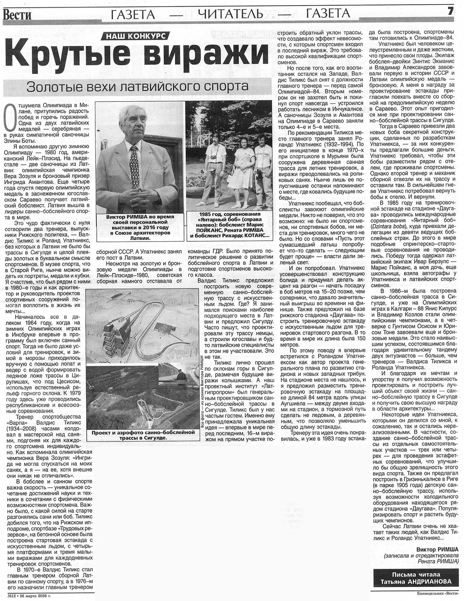 Премия Совета Министров СССР Виктору Римша за проектирование и строительство санно-бобслейной трассы в Сигулде